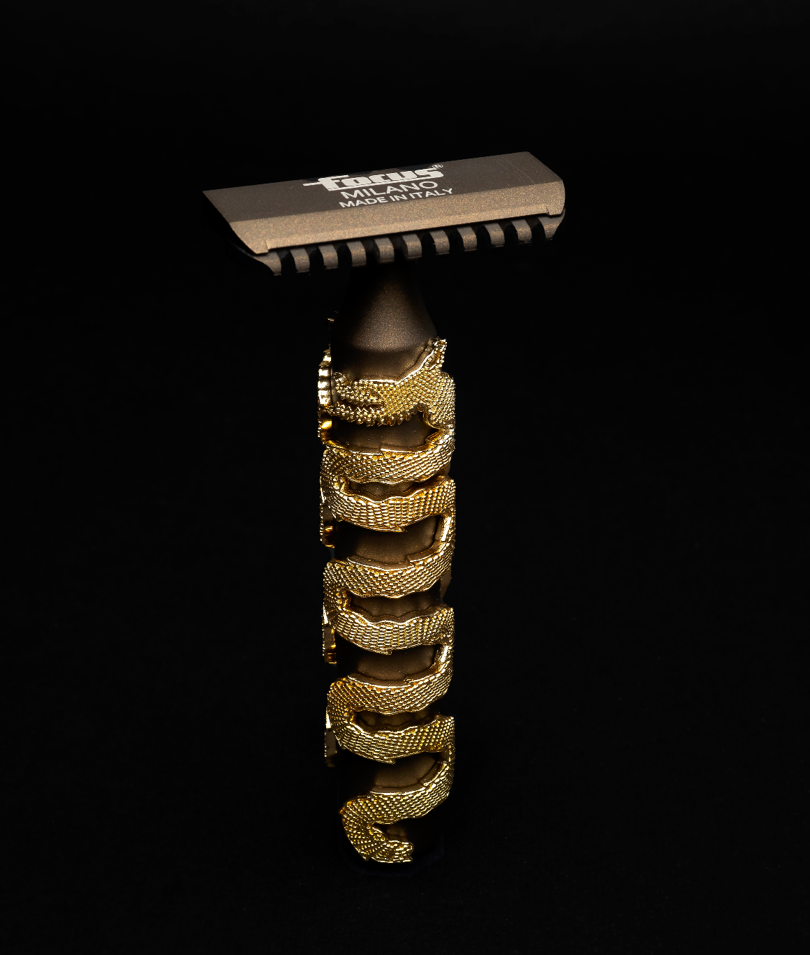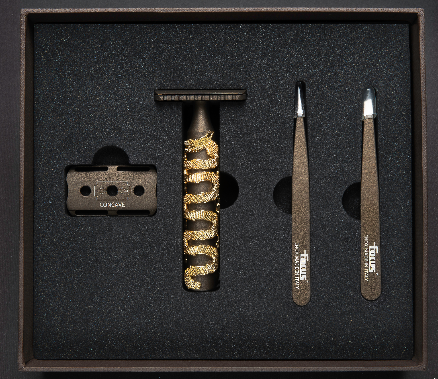 La Storia di Milano in un Rasoio. Realizzato con l’ausilio della tecnologia CNC, ripercorrendo le linee del classico pioniere dei double edge marchiati Focus. Ricoperto con una speciale ceramica, la quale garantisce una lunga protezione al rasoio e un effetto satinato per un grip ottimale. Spicca come vero e proprio gioiello il Biscione della città di Milano, realizzato in microfusione con acciaio 316 e palladio con oro 24k. Questa particolare lavorazione è realizzata a mano con la minuziosità e l’artigianalità tipiche dell’eccellenza italiana settoriale. All’interno del cofanetto sono presenti un monta-lama di ricambio per chi desiderasse la testina concava e due pinzette, una ad ago e una obliqua, anch’esse ricoperte in ceramica. dimensioni testa mm.25 x 45 – peso gr. 10 dimensioni manico mm.90 diam mm.18 (drago incluso) – peso gr. 60 peso totale del rasoio completo di testa e manico gr. 70.