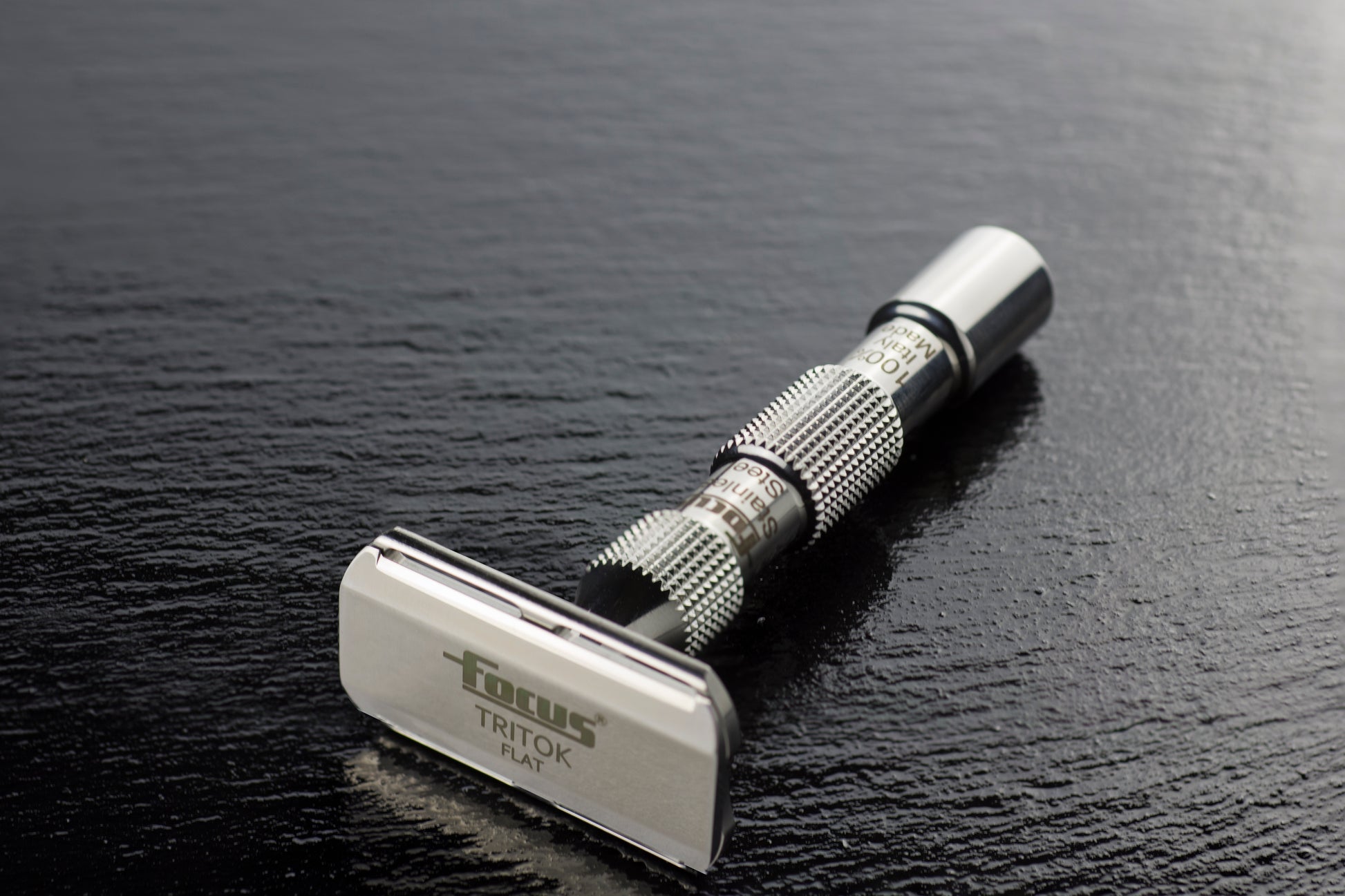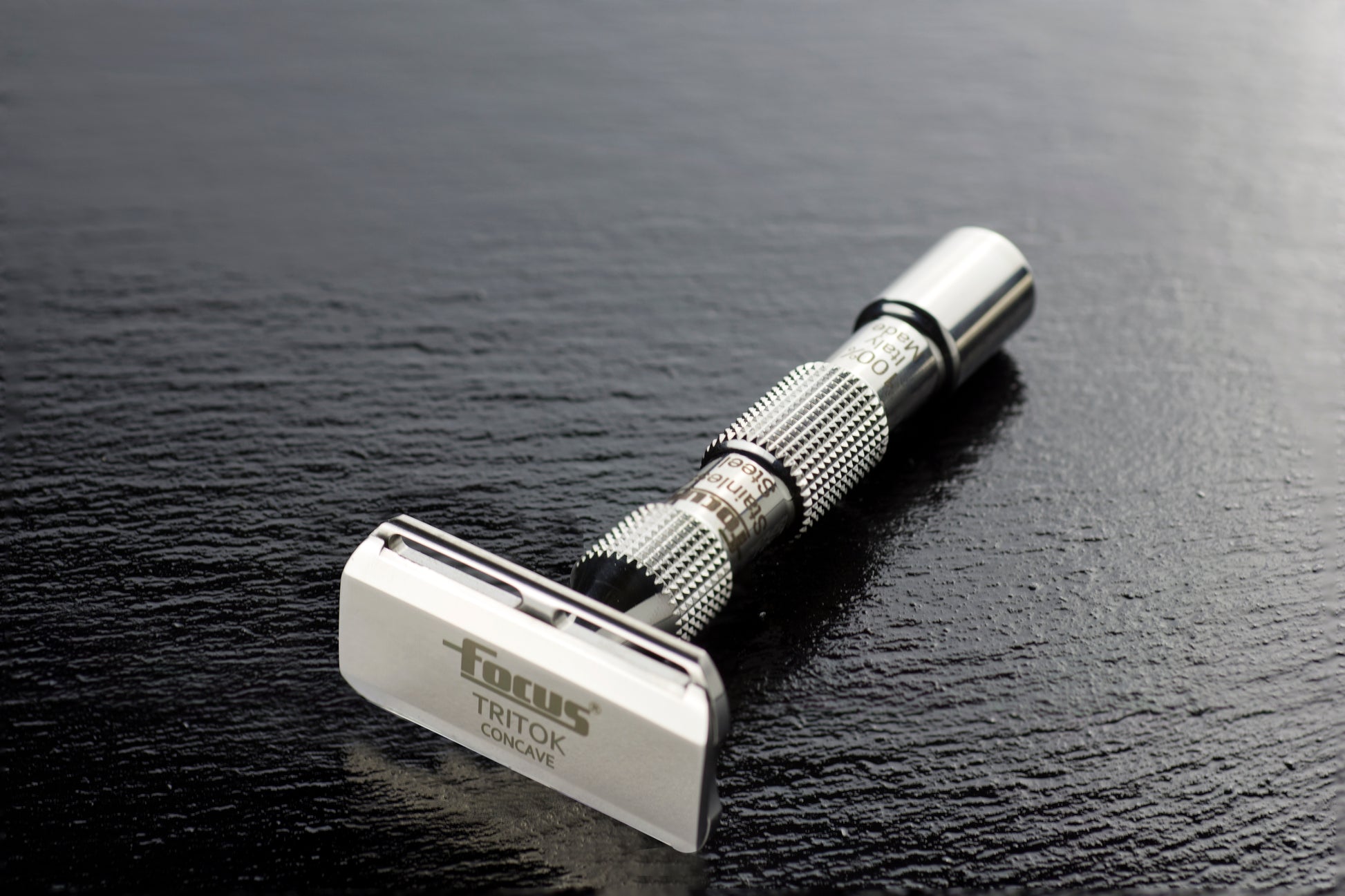 Tritok in acciaio inossidabile, malgrado il suo peso è ben bilanciato e la sua fessura di scarico sotto lama garantisce una pulizia rapida ed evita l’accumulo, anche dopo l’uso, con insaponata particolarmente carica e densa.